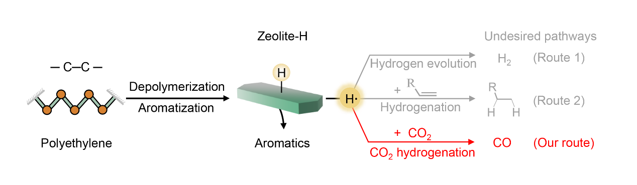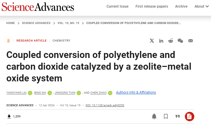 鉴于此,av影片 赵晨教授研究团队在废弃碳资源塑料和CO2的高价值利用上取得重要进展。构建了沸石-金属氧化物多相催化体系,通过芳构化-氢捕获机制耦合转化废弃聚乙烯与CO2为芳烃和CO。综合多种原位表征、同位标记、模型物的验证等手段,阐释了芳构化-氢捕获的反应机理。相关研究以“Coupled conversion of polyethylene and carbon dioxide catalyzed by a zeolite–metal oxide system”为题,于2024年4月12日发表于Science Advances。