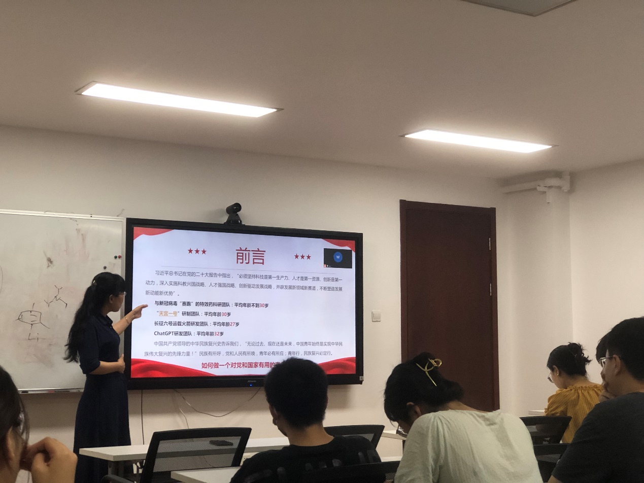 王媛媛老师首先介绍了中国青年在党的领导下的优秀事迹,强调了“无论过去、现在还是未来,中国青年始终是实现中华民族伟大复兴的先锋力量!”。接着结合自身成长经历、结合化学学科特色,从以德为先、要有理想、要有担当、要能吃苦和要肯奋斗五个方面激励学生党员在学习和成长中树立正确的价值观,坚定理想信念,锤炼品格,团结引领青年学子为实现中华民族伟大复兴而奋勇向前。学生党员表示通过王媛媛老师的党课,深受启发,在平时的工作中,要积极发挥党员先锋模范作用。
