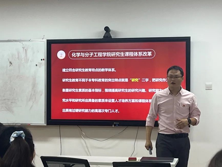 张中海老师谈到,学校以习近平新时代中国特色社会主义思想为指导,全面贯彻党的教育方针,落实全国研究生教育会议精神,践行学校“育人、文明、发展”三大使命,以立德树人、服务需求、提高质量、追求卓越为发展主线。同时分别详细清楚地介绍了化学院研究生课程体系改革和化学院研究生人才培养模式。最后张老师对同学们提出了三点期望,即“珍惜、自信、感恩”。通过张老师的党课,同学们收获颇丰,感触很大,表示要训练自己的科研本领,培养自身的思维素养和创新能力,让自己早日成为一名能够为国家、为人民服务的有用之才。