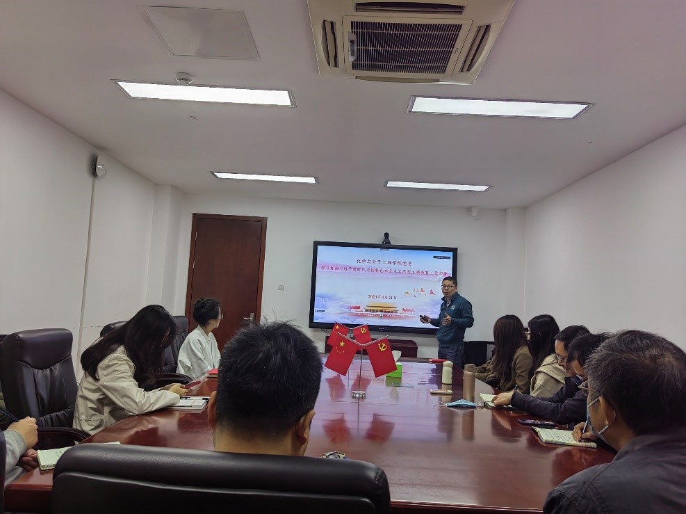 4月26日下午,党委书记鲜跃仲在闵行校区128会议室以“以学铸魂,深入学习贯彻习近平新时代中国特色社会主义思想”为主题向分析物化海水党支部党员讲党课。鲜老师对开展主题教育的目的、意义、具体要求、根本任务以及习近平新时代中国特色社会主义思想的主要内容向支部党员进行了详细介绍,同时结合学校和学院在开展主题教育方面的部署安排就“支部和党员如何开展主题教育”提出了意见建议。鲜跃仲谈到,党中央决定分两批在全党深入开展学习贯彻习近平新时代中国特色社会主义思想主题教育,对于我们每一位党员来说,其中非常重要的环节就是要牢牢把握住总要求中“学思想,强党性”的要求,要切实通过学习贯彻习近平新时代中国特色社会主义思想,达到“以学铸魂”的目标。习近平新时代中国特色社会主义思想是当代中国马克思主义、二十一世纪马克思主义,是马克思主义中国化的新飞跃。我们每一位党员都要坚持不懈用习近平新时代中国特色社会主义思想凝心铸魂,自觉用习近平新时代中国特色社会主义思想改造主观世界,不断增进对党的创新理论的政治认同、思想认同、理论认同、情感认同,坚定理想信念、提升思想境界、加强党性锻炼,做到对党忠诚,在政治品格、价值追求、精神境界、作风操守等方方面面都要始终保持共产党人的先锋模范作用。4月10-13日,习近平总书记在广东考察时指出,“以学铸魂,就是要做好学习贯彻新时代中国特色社会主义思想的深化、内化、转化工作,从思想上正本清源、固本培元,筑牢信仰之基、补足精神之钙、把稳思想之舵。”作为高校的党员教师,我们首先要通过主题教育,进一步强基固本,坚定理想信念,以实际行动真心爱党、时刻忧党、坚定护党、全力兴党,才能有底气、有信心、有能力站稳三尺讲台,做好学生锤炼品格的引路人。