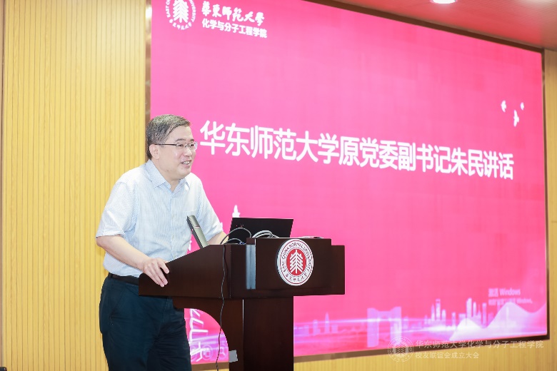 朱民在讲话中表达了对学校和学院的诚挚感谢,回忆了自己43年前进入华师大学习以及在化学系工作18年的经历,指出化学院在人才培养、科学研究、社会服务、文化传承创新等方面屡创佳绩,培养了一批批优秀校友。学院要进一步发挥好优良传统,汇聚校友力量,集聚校友资源,促进学院和学校事业发展。