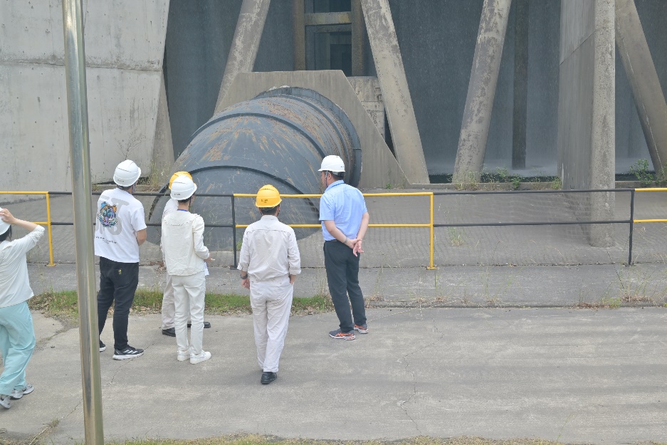 随后,师生们来到了第二站——上海市吴泾第二发电有限公司。发电部副经理秦松波对学院师生的到来表示热烈欢迎,并简要介绍了公司的概况及循环冷却塔的相关知识。在安全部卢纲工程师以及相关技术负责人的指导下,师生们在接受安全教育后参观了公司的循环冷却装置。在装置现场,师生们了解到冷却水通过严格的逆流换热过程,降低了约10℃的温度,使其可以直接排放或循环使用,进而有效减少发电过程中产生的热污染对周边水体生态环境的影响。