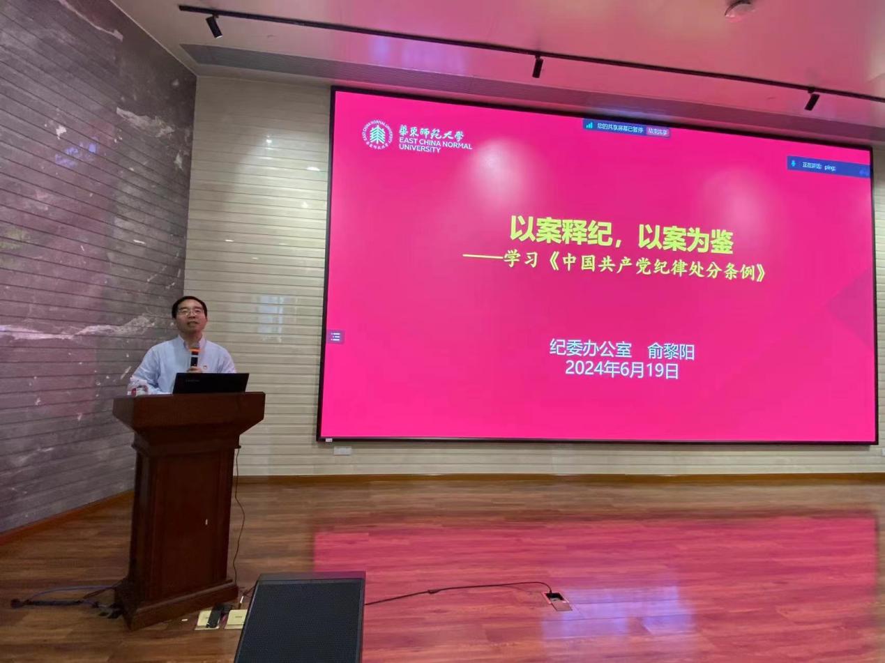 为深入学习贯彻习近平总书记关于加强党的纪律教育的重要论述,推动党纪学习教育入脑入心走深走实,2024年6月19日下午,av影片 举行师生党员集中培训暨党纪学习教育专题党课。校纪委副书记、纪委办公室主任、监察处处长俞黎阳作“以案释纪,以案为鉴——学习《中国共产党纪律处分条例》”的专题辅导报告,报告会由院党委书记王媛媛主持。全院五百余名师生党员分别在闵行、普陀两校区会场参加学习。