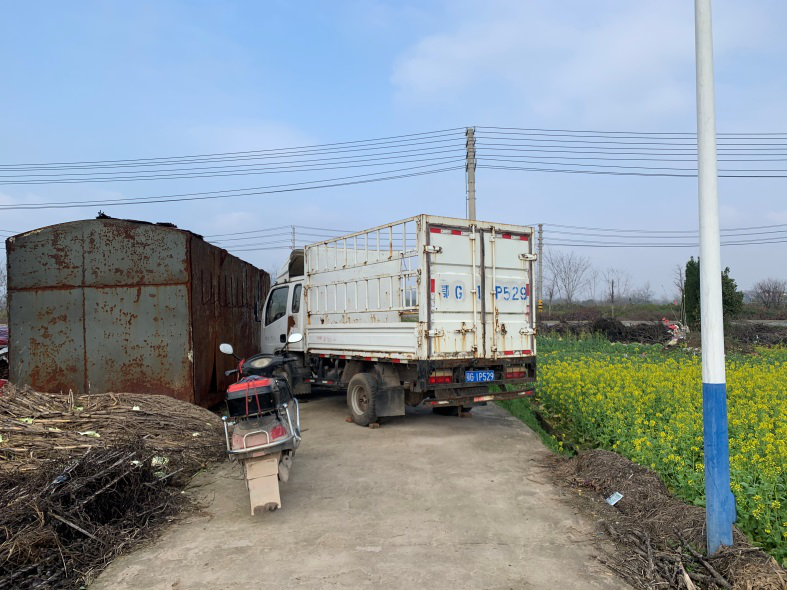 防控疫情的第一步就是阻止村内外人员的随意流动,因此,我们把村子的两个进出口都用障碍物封锁起来(如图,一辆货车堵住了进村的主要路口)。接着,每个村口每天都安排两个人把守,2小时一轮岗,严格管制人员流动。我也戴上了红色的小帽和袖标,在村口站岗,如若有人想进出村口,立即上前阻止。