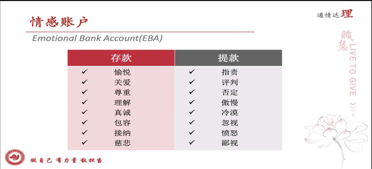 最后,对于情绪的管理,季老师给出了自己的小妙招——设置“情感账户”。“情感账户”有助于我们通过反思自己的行为是“情感存款”还是“情感提款”,来管理自己的情绪状态。希望大家的情感账户都有余额哦!