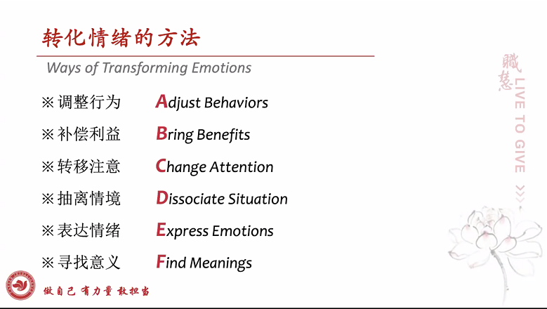 觉察到自我或他人情绪后该如何转化呢?季婉老师给我们分享了调整行为、补偿利益、转移注意、抽离情境、表达情绪、寻找意义等六种方法。