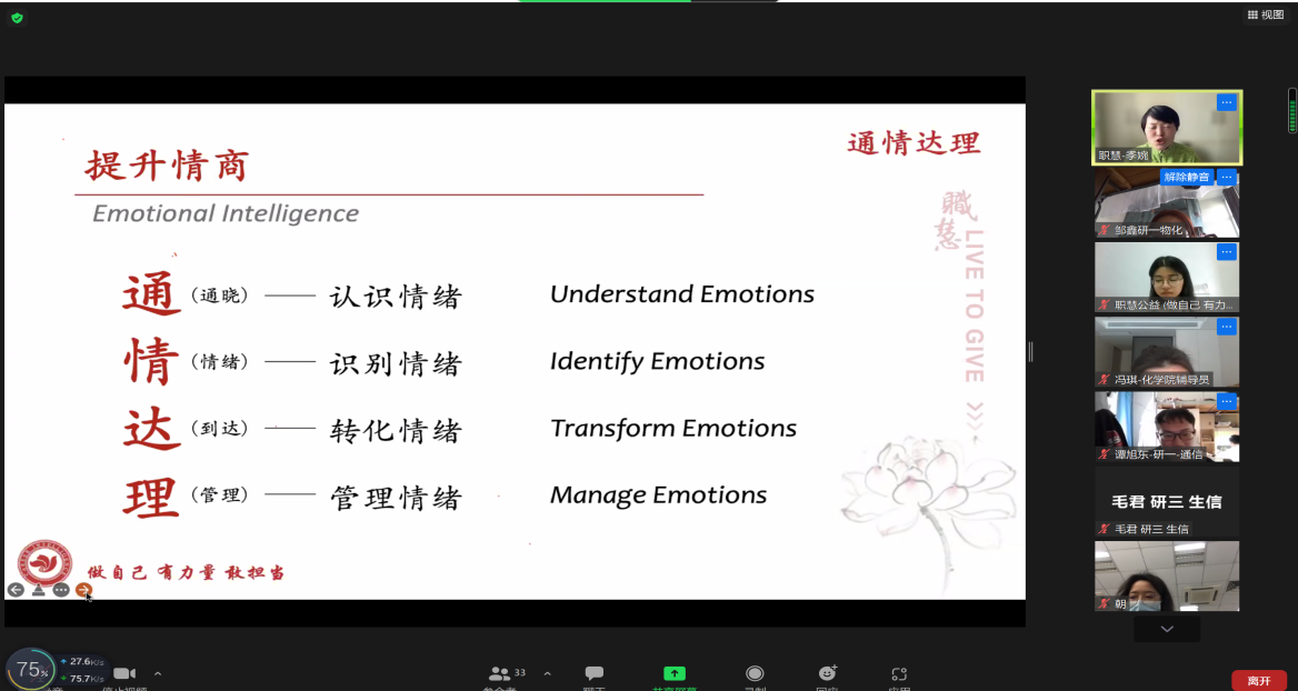 3月16日下午14:00-16:00,av影片 特别邀请了北京职慧公益创业发展中心(简称“职慧”)的季婉老师为大家带来了一堂关于情商的线上课程,课程由职慧助教主持,课程面向全校师生。