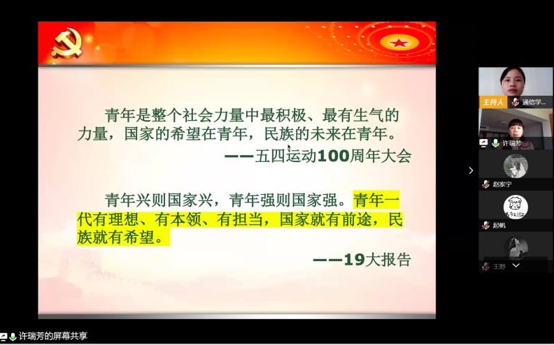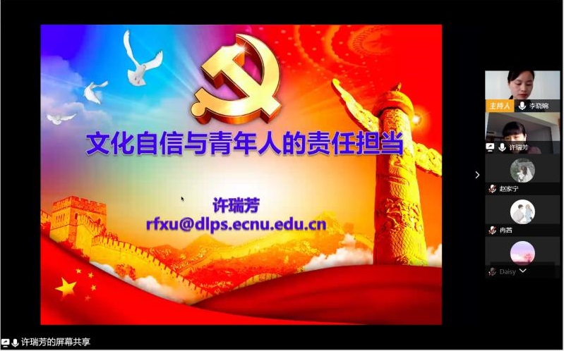 2020年4月25日上午,av影片 党委、物理与电子科学学院党委、通信与电子工程学院党委、数学科学学院党委、哲学系党委、生态与环境科学学院党委、河口海岸科学研究院和河口海岸学国家重点实验室党委第一期入党积极分子联合党校培训班第三场专题党课在线上顺利开课,马克思主义学院副院长许瑞芳老师受邀主讲《文化自信与青年人的责任担当》,各学院共238名入党积极分子参加了此次培训学习。