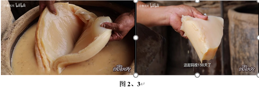 “酸”是一种不太讨人喜欢的味道,它能通过空气和味蕾给予人们最直观的感受。(图4)生活中接触最多的酸就是食物中的酸,比如常吃到的酸菜、酸梅、酸奶、酸枣等。前阵子一个网络热门视频引起了大家的关注——古法酿醋作坊的醋坛子里长出了肥肉一样的东西,酿醋大叔还直接撕下一块,尝了一口,并称赞味道相当好,这究竟是怎么回事呢??(图2、3)