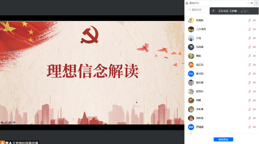 在听取完三个部分的讲解后,与会同学积极交流谈论,结合自身经历分享自己关于理想信念的理解。李新童同志分享了其在本科期间参加支教活动,与同学们深入交流,积极引导,培养和坚定了新一代青少年的理想信念;谭靖雯同志分享了其留学生同学如何克服地域、文化等差异,在生活中助人为乐,积极进取,这种坚定、执着的精神感染着身边的每一个同学和朋友。还有很多同学分享自己和自己身边关于理想信念的事迹。