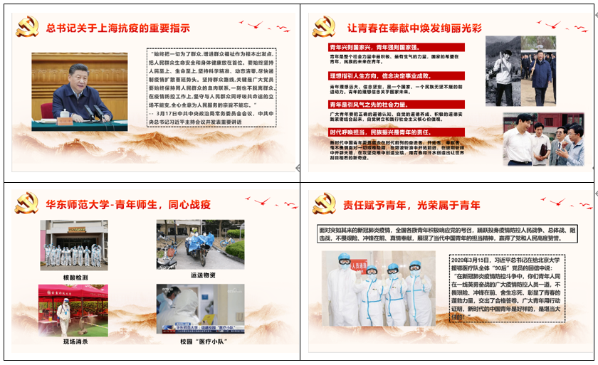 随后,他结合了习近平总书记关于上海疫情防控重要指示,总结了底线思维、精准防控、生命至上、化解风险、最大限度、毫不放松、持之以恒的指示精神,强调了党员同志要统一思想、聚共识凝合力,勇于担当、做好表率。紧接着,他通过视频的形式回顾了近日av影片 的青年师生在核酸检测、运送物资、现场消杀的场景,并分享了登上央视的“校园医疗小队”的成功经验。这体现了青年党员与共青团员在面对疫情时不畏艰险、冲锋在前、真情奉献的可贵精神,彰显了青春的蓬勃力量,证明了新时代的中国青年是好样的,是堪当大任的。