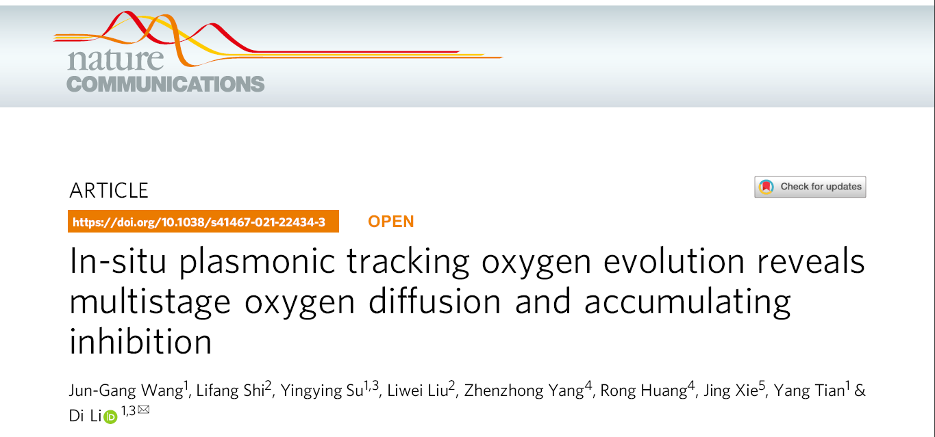 av影片 李迪课题组在多相反应界面电化学析气反应原位监测方面取得重要进展。该成果以“In-Situ Plasmonic Tracking Oxygen Evolution Reveals Multistage Oxygen Diffusion and Accumulating Inhibition”为题于2021年4月12日发表于Nature Communications (Nature Commun. 2021, 2164)。