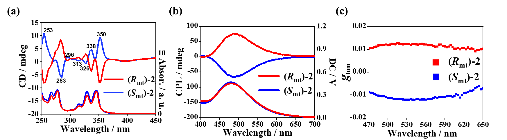 图2. (a)拓扑手性[2]索烃的紫外-可见吸收光谱和圆二色光谱;(b)拓扑手性[2]索烃的荧光和圆偏振发光光谱;(c)拓扑手性[2]索烃的不对称发光因子。图片来源:Angew. Chem. Int. Ed.