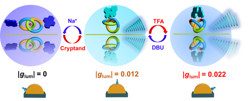可切换型圆偏振发光体系的原位调控不仅可在避免重复合成的情况下实现多样化的圆偏振发光,而且有望应用于手性传感和智能器件等领域,具有重要的科研价值和应用潜力。然而,目前报道的可切换型CPL材料大多为单向切换且glum相对较低,开发具有多重圆偏振发光状态且具有相对高 glum的新型 CPL 材料是该领域的前沿课题之一。基于课题组在超分子化学拓扑学领域的研究基础(Acc. Chem. Res.2021, 54, 4091)以及前期探索,团队通过阴离子驱动手性大环的移动来调控手性源到生色团的手性传递,成功实现了基于聚集诱导发光手性[3]轮烷的可切换型圆偏振发光体系的构筑(Angew. Chem. Int. Ed. 2021, 60, 9507.)。