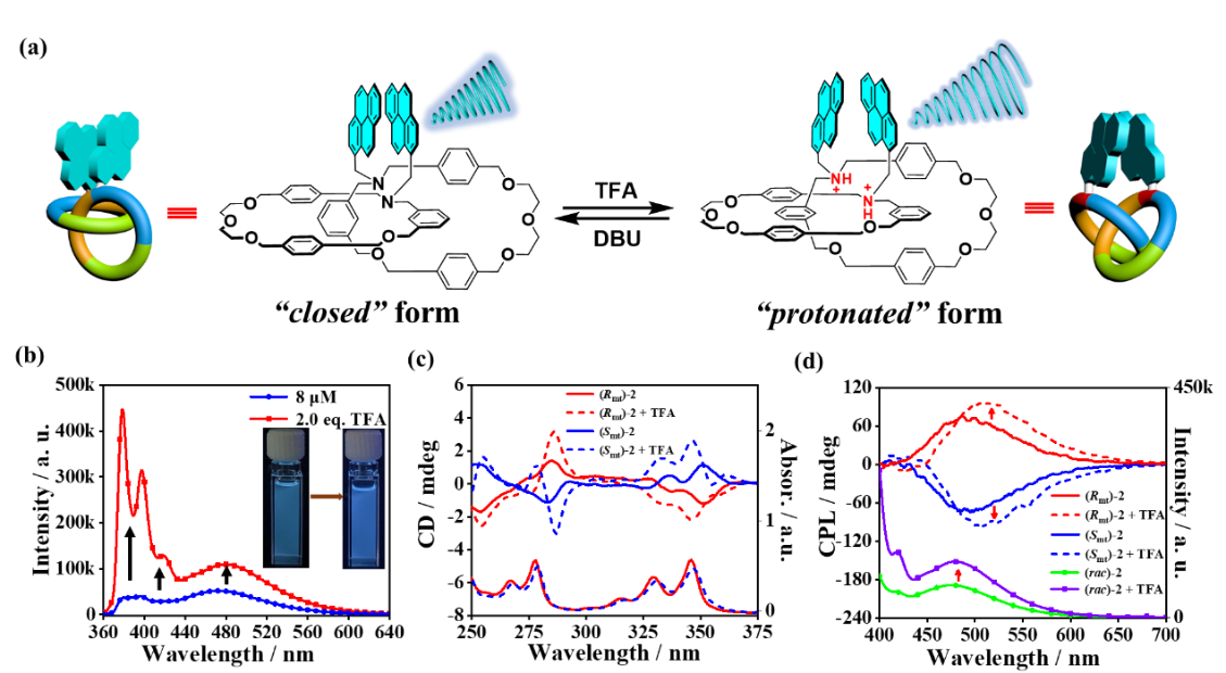 图4. (a)拓扑手性[2]索烃的可逆共构象转化示意图;(b)加入TFA刺激前后的荧光光谱;(c)加入TFA刺激前后的紫外吸收光谱和圆二色光谱;(d)加入TFA刺激前后的圆偏振发光光谱。图片来源:Angew. Chem. Int. Ed.