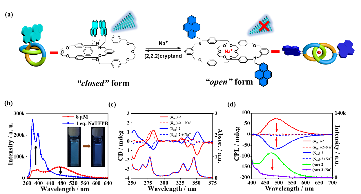 图3. (a)拓扑手性[2]索烃的共构象可逆转化示意图;(b)加入Na+刺激前后的荧光光谱;(c)加入Na+刺激前后的紫外吸收光谱和圆二色光谱;(d)加入Na+刺激前后的圆偏振发光光谱。图片来源:Angew. Chem. Int. Ed.