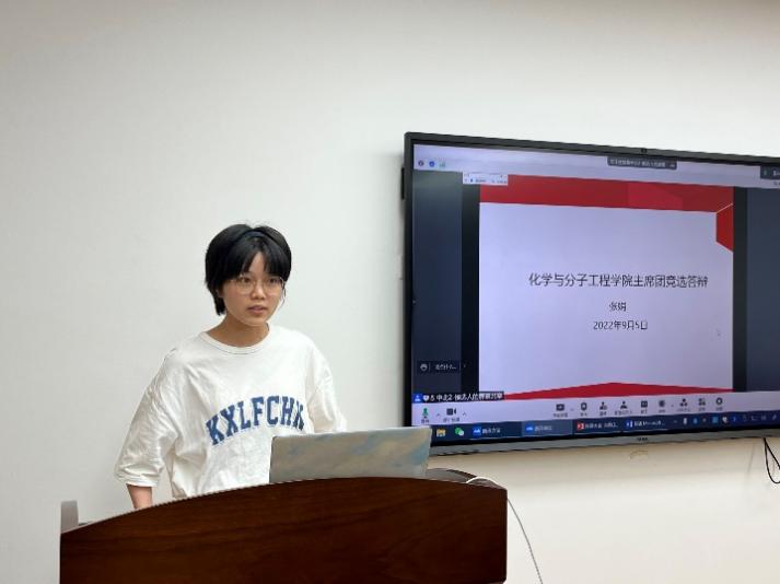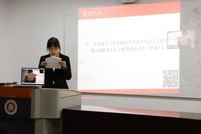 9月8日晚6时,av影片 第八届研究生代表大会在闵行化学楼135会议室正式召开。出席本次会议的老师有院党委副书记王婷婷老师、团委老师冯琪老师、研究生辅导员王梦雅老师,参会嘉宾有校精密光谱科学与技术国家重点实验室研会主席管江林、生命科学学院研会主席崔耀楠、国际关系学院研会主席潇阳和计算机科学与技术学院研会主席钱栋炜。化学院第八届研究生学生骨干及成员出席了本次会议。会议由化学院第八届研会主席陈静和王莹同学主持。本次会议评定了2021-2022学年化学院研会的工作情况,选举了新一届的主席团成员,公布了2022年化学院研究生会优秀主席团成员、优秀部长、优秀干事的评选结果。
