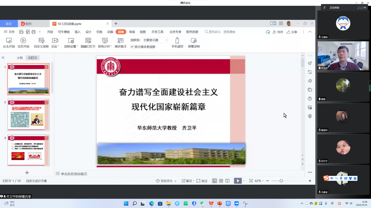 10月12日下午,av影片 、物理与电子科学学院、通信与电子工程学院、数学科学学院、哲学系第二期学生联合党校第二课开讲。上海市中共党史学会副会长、上海市委讲师团党史学习教育专家宣讲团成员、我校终身教授齐卫平作主题报告,会议由物理与电子科学学院党委副书记蒋旭主持。