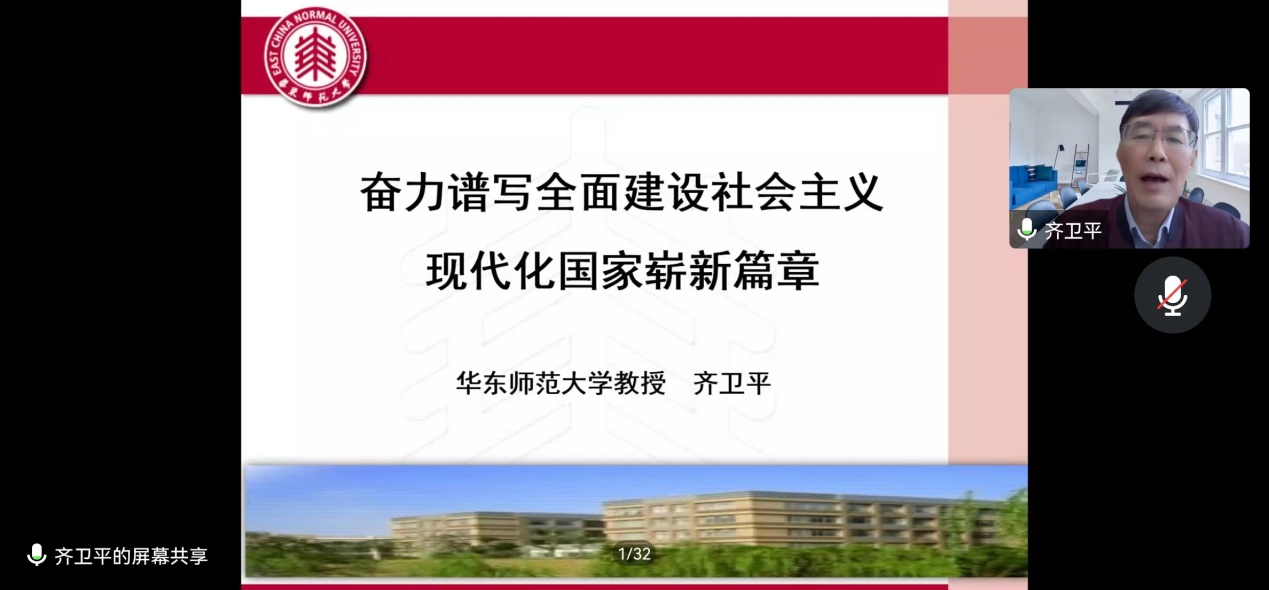 齐卫平以《奋力谱写全面建设社会主义现代化国家崭新篇章》为题,围绕习近平总书记“7.26”重要讲话精神,结合当今时代国内外形势深刻变动新情况,对如何理解“谱写崭新篇章”进行了深入阐述,同时从“布局谋长远、开局打基础、谋局抓重点、解局定策略”四个方面阐述了即将召开的中国共产党第二十次全国代表大会作出战略谋划的重要意义。最后,他结合党的十九大报告、《中共中央关于党的百年奋斗重大成就和历史经验的决议》、习近平新时代中国特色社会主义思想等党中央近年来的重要理论创新,对党的二十大将提出的重大理论观点和重大战略思想谈了体会。