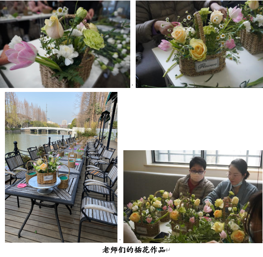 一个个错落有致的花篮在老师们的巧手中诞生,现场的老师们相互交流分享着插花的心得,在芬芳花香中笑语满堂。鲜花衔来了春意,点亮了属于她们的专属节日,花丛明媚,映衬着老师们的如花笑靥。在活动最后,老师们带走了自己用心制作的锦簇花篮,也捎带了一篮春日的祝福与美好的期许。