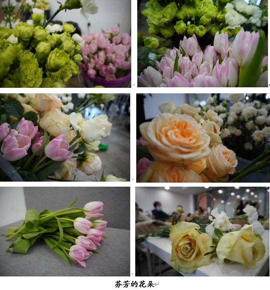 随后,一朵被精细剪裁过、娇艳欲滴的香槟玫瑰作为焦点花傲立于郁金香丛中,继而两朵陪衬的玫瑰也被老师们小心地插于周围。最后,或青或白的康乃馨、灵动艳丽的洋甘菊也依次被置于群芳中争相绽艳。