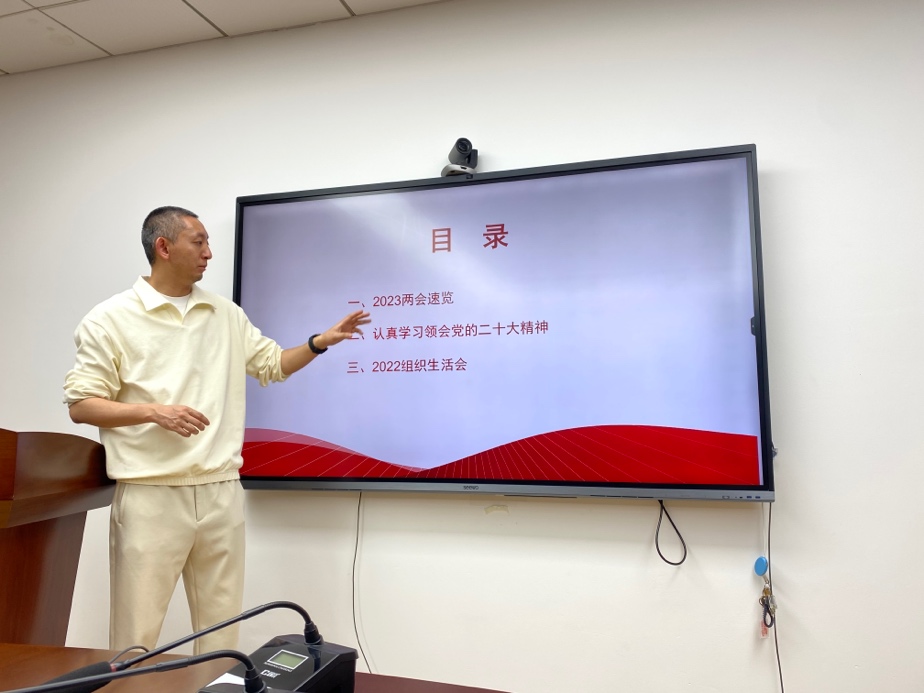 会议伊始,支部书记张亮带领与会党员一起学习2023年全国两会的相关动态,带领大家再次认真学习领会党的二十大精神。今年是全面贯彻落实党的二十大精神的开局之年,今年全国两会是党的二十大后召开的第一次全国两会。全国两会胜利召开,把党的主张和人民意愿凝聚为国家意志,通过法定程序把党的二十大作出的决策部署转化为全国人民的实际行动,这对贯彻落实习近平新时代中国特色社会主义思想和党的二十大精神,动员全党全国各族人民为全面建设社会主义现代化国家、全面推进中华民族伟大复兴而团结奋斗,具有十分重要的意义。
