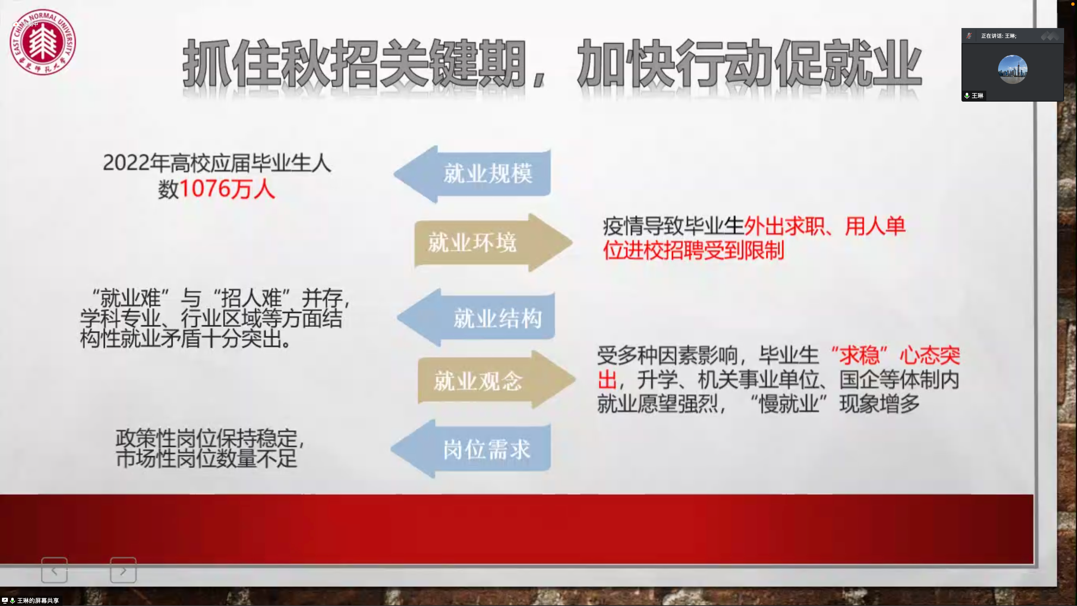 为帮助2023届毕业生更好地了解就业政策,以科学的态度规划职业生涯,化“被动就业”为“主动择业”,10月26日下午,av影片 规“化”研途之就业政策点拨大会于线上举办。本次讲座邀请了学生职业发展中心学生事务部主管王琳老师作为主讲嘉宾,讲解就业形势政策、就业流程和落户政策等内容。院党委副书记王婷婷老师、团委书记冯琪老师、毕业班辅导员王梦雅老师出席活动,此次讲座由王梦雅主持。