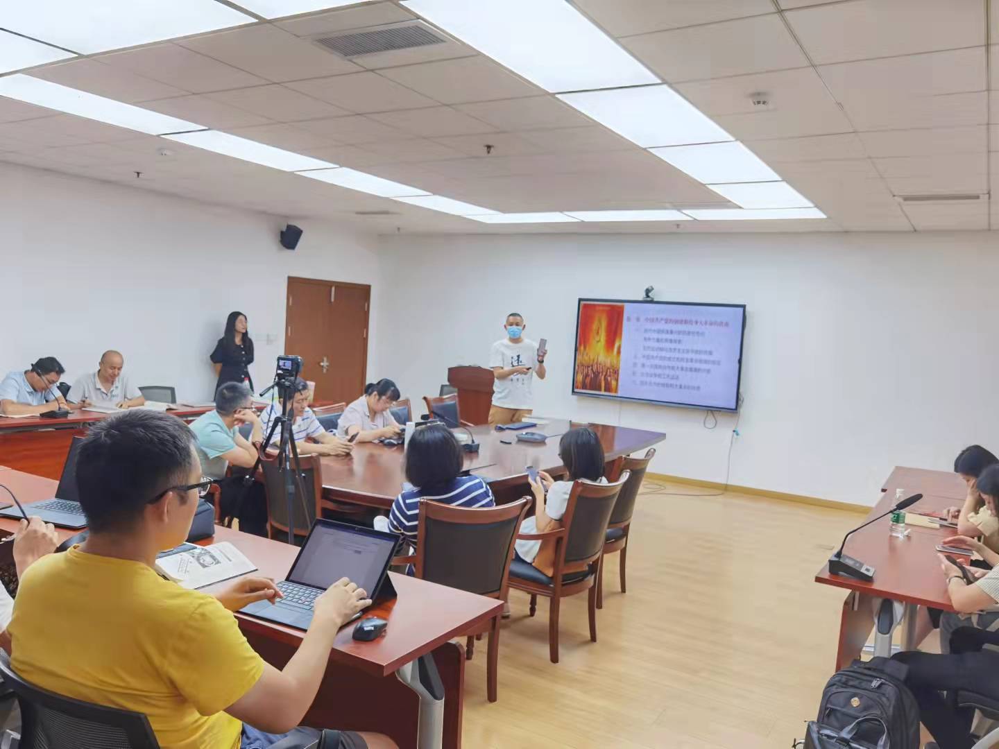 最后,针对本学期要进行的党小组微党课展示,支委们准备了《共产党党史》第一章节的示范讲演,由张亮主讲。张老师从“近代中国民族复兴的历史任务和各种力量的艰难探索”“五四运动和马克思主义在中国的传播”“中国共产党的成立和民主革命纲领的制定”“第一次国共合作和大革命高潮的兴起”“北伐战争和工农运动”和“国共合作的破裂和大革命的失败”六小节内容出发,深入浅出地为大家解读中国共产党在创建初期经历的波折和积累的宝贵革命经验。