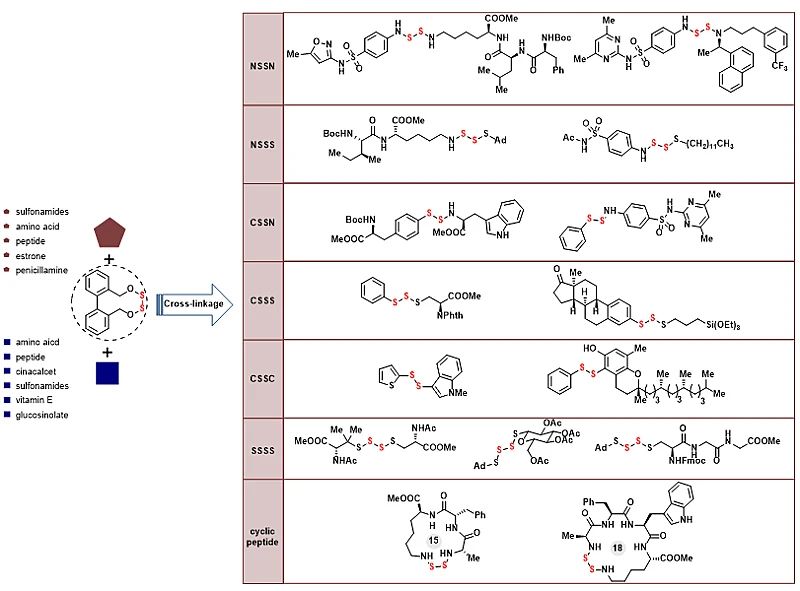 以十元环1f为最优试剂,以金属铜为催化剂,无碱参与的条件下就能以84%的收率完成对苯硼酸的偶联;以八元环试剂1d为最优试剂,可以76%的收率完成对硫醇的连接,并进一步得到系列的非对称四硫化合物。作者在硫硫键两侧用氮亲核试剂、硫亲核试剂以及碳亲核试剂与环状二硫试剂有序地连接,高兼容性地得到了六种不同类型的多硫化合物:NSSN、NSSS、CSSN、CSSS、CSSC、SSSS(图4)。此外,这一双边二硫试剂还可应用于环肽的构建。以直链三肽为底物,可以实现二硫链接的15元环肽;以直链四肽为底物,可以实现二硫链接的18元环肽。值得一提的是,该策略实现的底物范围很广:第一模块有磺胺类药物、氨基酸、多肽、雌酚酮、青霉胺,第二模块有氨基酸、多肽、西那卡塞药物、磺胺类药物、维生素E、甚至巯基糖苷(图4)。