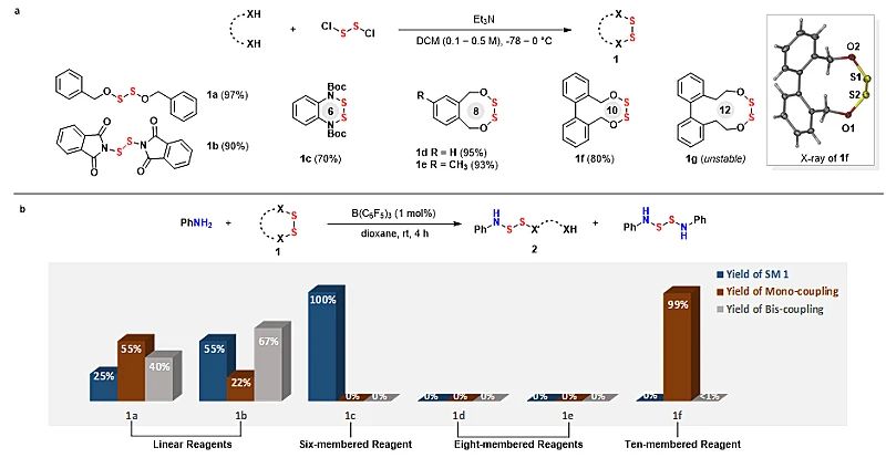 尽管如此,如何在二硫单元两侧自由而便捷地安装所期望的模块,以获得多样性功能的多硫化合物依然是一个难题。近日,该课题组再次以“面具效应(mask effect)”为策略,通过对刚性联苯中环嵌入二硫单元获得稳定双边二硫试剂,基于中环张力的开闭环能量差,实现二硫两侧模块化和可控化安装(图2a)。通过分子力学方法(MM2)的计算进一步预测:刚性联苯中环二硫结构分子,两个S-O键在开闭环结构下能量差可达9.53 kcal mol-1(八元环)和5.22 kcal mol-1(十元环),可有效地选择性区分两个硫氧键,实现了模块化和可控化安装(图2b)。