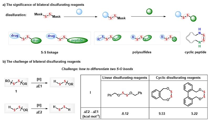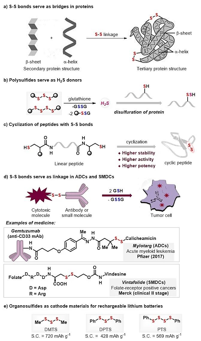 硫,具有独特的数量态维度变化。硫原子个数的精准控制(二硫、三硫、四硫)会给生命系统带来不同的还原电势氛围,会为生命信号传导带来可控缓释的硫化氢,会令靶向药物释放实现定向可逆断裂,会使有机光电材料产生优越的折射率,还会让锂硫电池产生独特的储能特质。因此,S-S单元在生命科学、药物化学、能源化学、材料科学等领域都扮演着重要的角色(图1)。