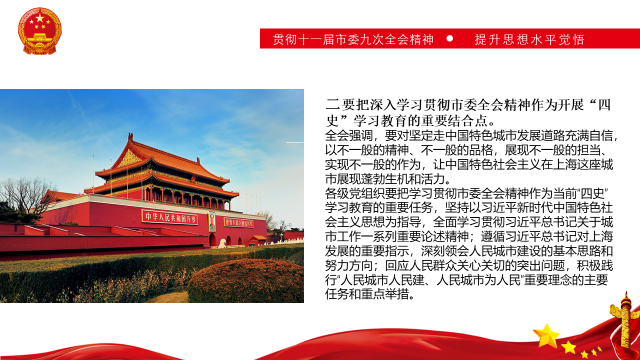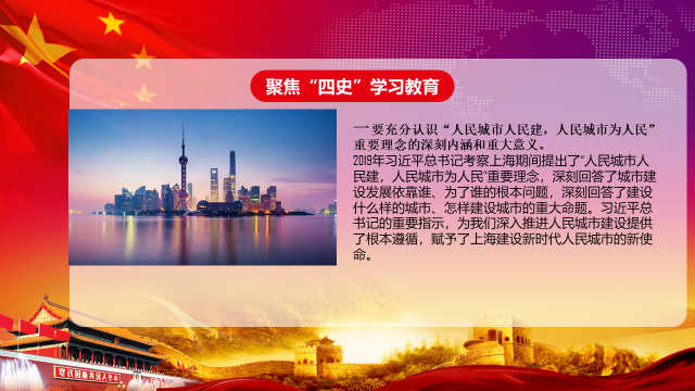 二是要把深入学习贯彻市委全会精神作为开展“四史”学习教育的重要结合点。即坚持以习近平新时代中国特色社会主义思想为指导,全面学习贯彻习近平总书记关于城市工作一系列重要论述精神;遵循习近平总书记对上海发展的重要指示,深刻领会人民城市建设的基本思路和努力方向;回应人民群众关心关切的突出问题,积极践行“人民城市人民建、人民城市为人民”重要理念的主要任务和重点举措。