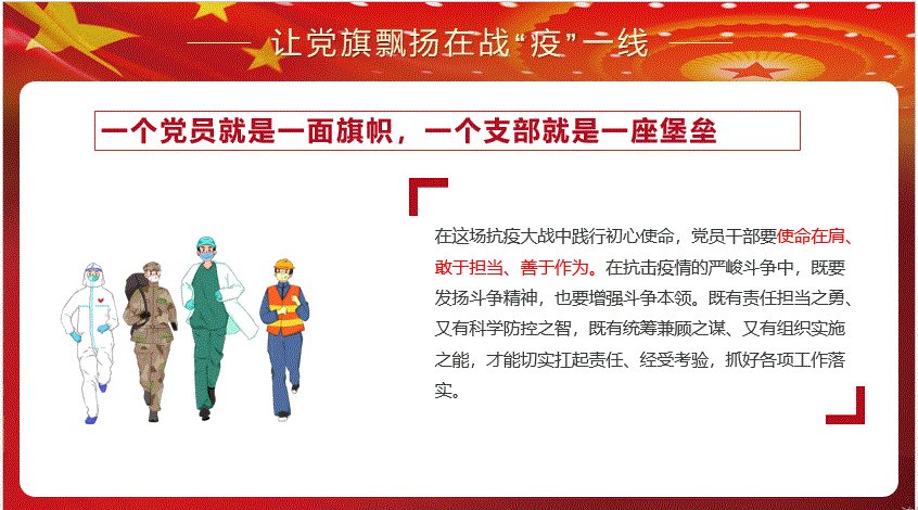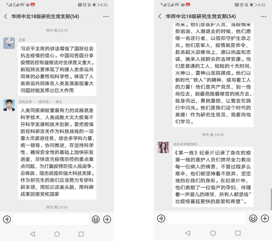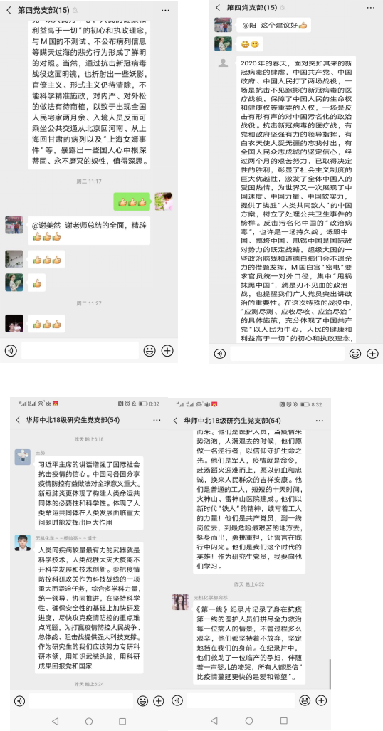 其他支部也分别通过线上平台学习习近平总书记重要讲话、关于疫情的科学知识、中央的一系列文件,学习在抗疫中涌现出来的先进事迹和模范人物,,在这场战“疫”中,党员干部冲锋在前,这些都给党员同志们上了一堂生动的党课各支部线上讨论分享如何发挥党员的先锋模范作用,表达了对中国制度优越性的自豪和作为中国人的骄傲,同时表达了对抗疫一线的工作人员、社会各处的志愿者们、在后方维持稳定、保证物资供应的公务人员及抗疫中涌现出的先锋企业及先进人物的敬意。