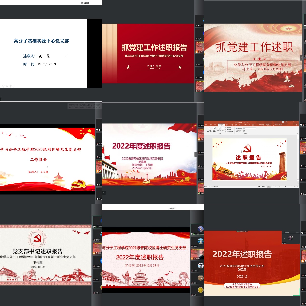 会上,高分子实验中心党支部书记黄琨、上海分子新药研究中心党支部书记张亮、分析物化海水党支部书记马士禹、2020级闵行校区研究生党支部书记王玉柱、2020级普陀校区研究生党支部书记杨嘉豪、2021级闵行校区博士研究生党支部书记朱韵、2021级闵行校区硕士研究生党支部书记王伟琛、2021级普陀校区博士研究生党支部书记罗娟娟和2021级普陀校区硕士研究生党支部书记张见闻进行了述职汇报。九位师生党支部书记重点围绕贯彻《av影片 党支部工作细则(试行)》要求,落实基层党支部“七个有力”建设标准情况,支部工作特色、存在的问题、后续工作思路举措等进行了工作交流。任职未满三个月的党支部书记提交了书面述职报告并通过线上学习的方式对支部书记如何抓支部建设、提升组织力、加强引领思想、促进活动创新等方面进行了交流。