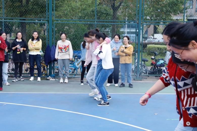 在“袋鼠跳”项目中,师生采用迎面接力形式,双脚套在袋子中跳跃前进,按完成时间进行排名,其中紫队一马当先,拔得头筹。