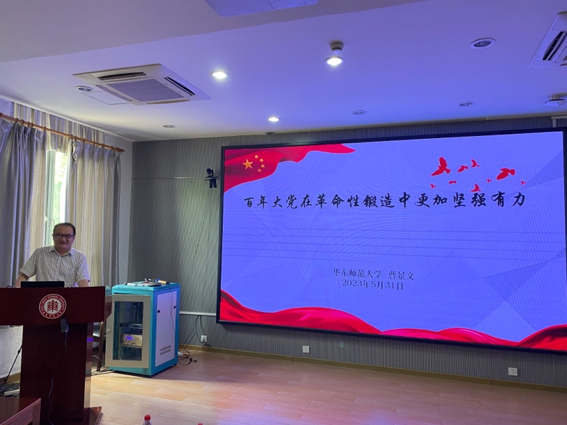 马克思主义学院教授、博士生导师、中国近现代史纲要教研部主任曹景文老师作专题报告。上海分子新药研究中心党支部联合上海绿色化学重点实验室党支部共同开展此次主题党日活动,两支部党员在普陀校区化学馆A205报告厅集中参与学习,反响热烈。报告由上海分子新药研究中心党支部书记张亮主持。
